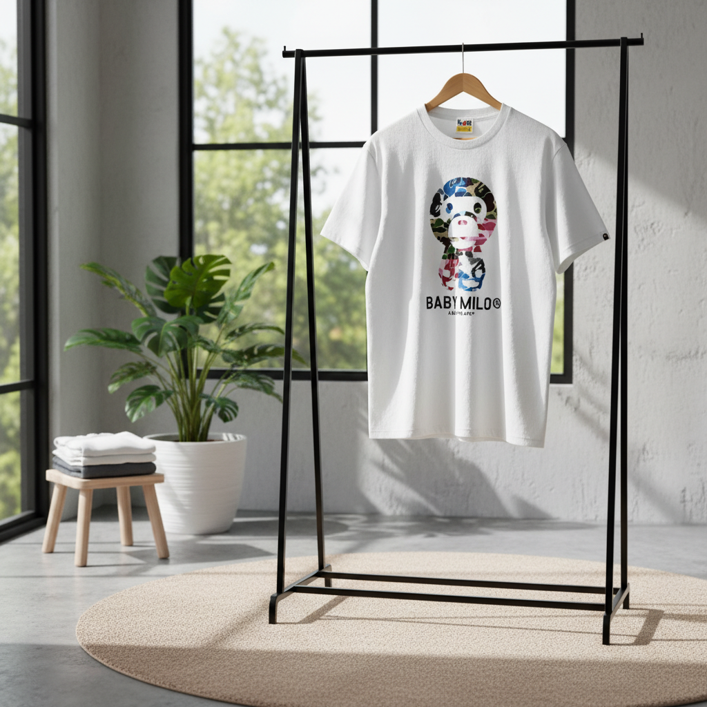 A Bathing Ape Baby Milo White T-Shirt made from premium cotton, soft and breathable, featuring colorful camo Baby Milo print and brand logo, unisex streetwear style for daily comfort and individuality.
