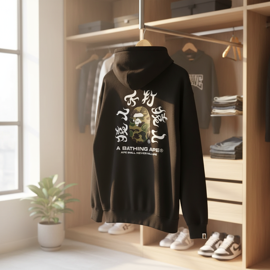 A BATHING APE black cotton hoodie, soft and breathable, features iconic camo ape head and white art lettering with slogan “APE SHALL NEVER KILL APE”; unisex streetwear for stylish daily comfort.
