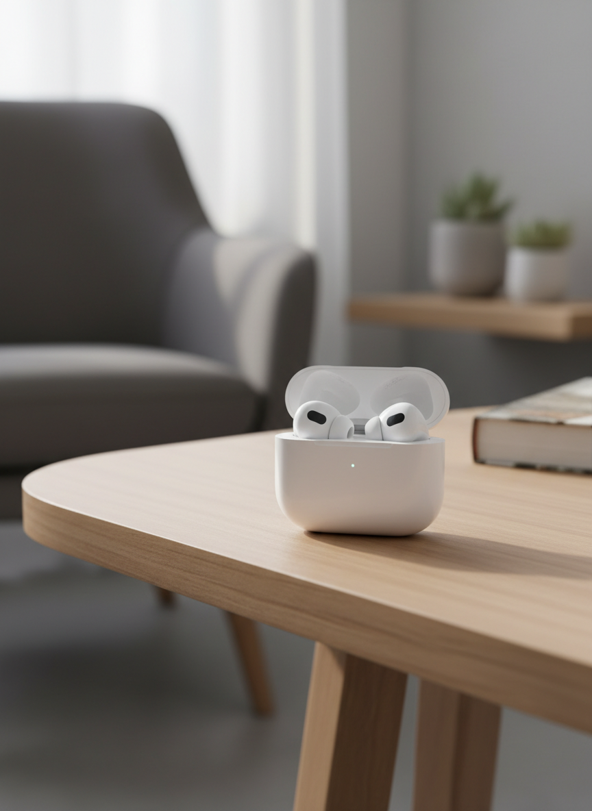 Apple AirPods Series White Wireless Bluetooth Earbuds with Active Noise Cancellation, smooth plastic design, modern tech style, comfortable, portable, ideal for daily use by men and women.