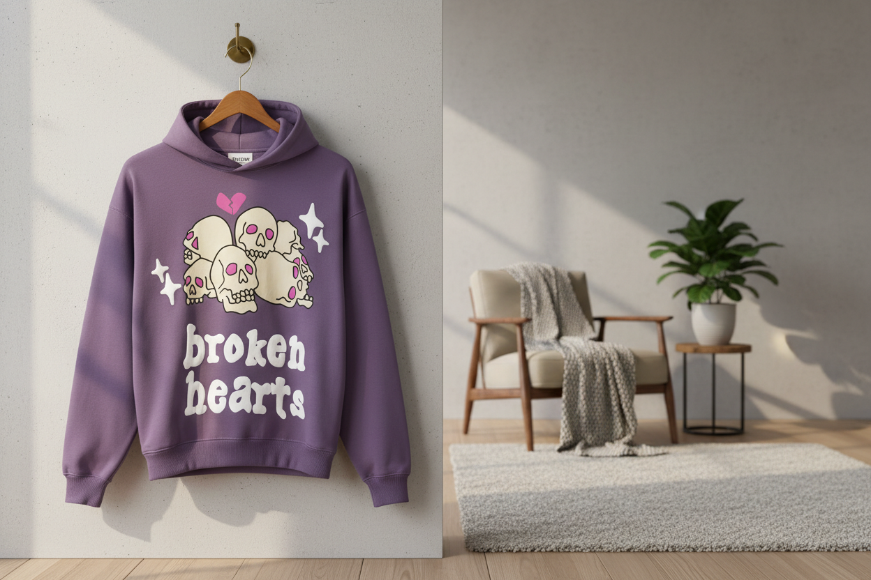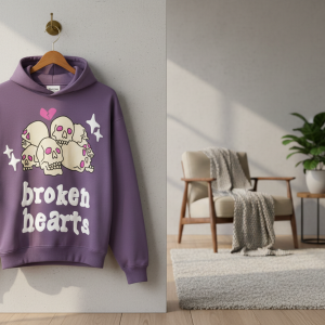 Broken Planet “Broken Hearts” Purple Hoodie crafted from premium cotton, features cartoon skulls, melting hearts, and star prints. Unisex loose fit, soft touch, perfect for streetwear and casual style.