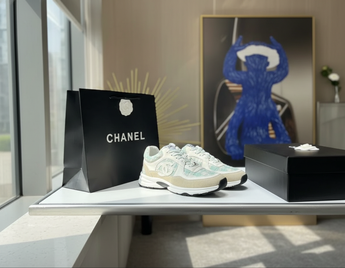 Chanel Mint Green White Tweed Leather Sneakers with iconic CC logo, unisex, breathable and stylish, perfect for everyday casual luxury wear.