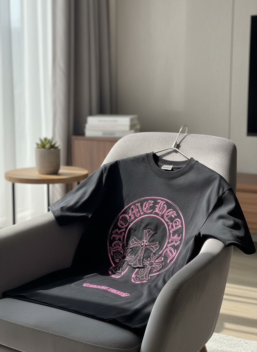 Chrome Hearts Black T-Shirt with Pink Gothic Cross Graphic, Premium Cotton Casual Tee for Streetwear Fashion