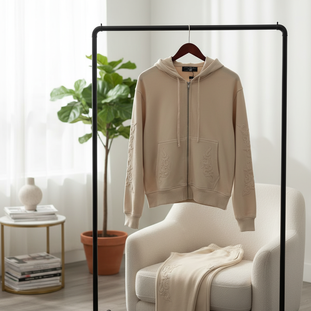 Derschutze Beige Embroidered Hoodie Set – Soft cotton fabric with textured pattern, zip-up design and drawstring hood, loose fit for comfort and style, unisex streetwear with modern minimalist aesthetic.
