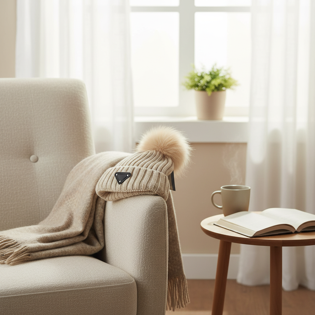 Prada Classic Beige Knit Pom Hat – soft ribbed material, fluffy pom on top, signature black triangle logo, stylish luxury unisex winter accessory offering warmth and trend.