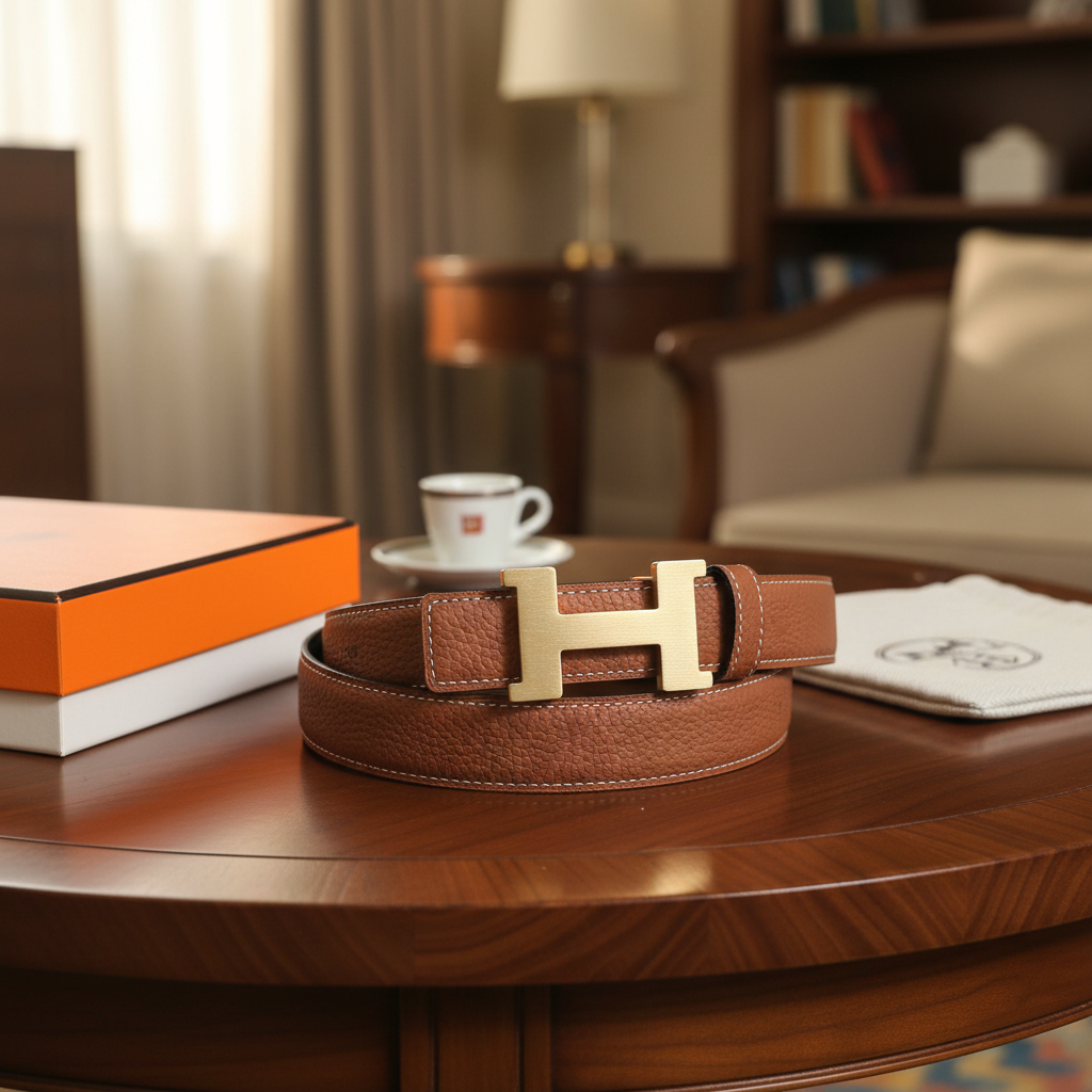 Hermes classic brown leather belt with gold H buckle, crafted from premium grained calfskin. Unisex design blends French minimal elegance and fine stitching for timeless luxury and everyday style.