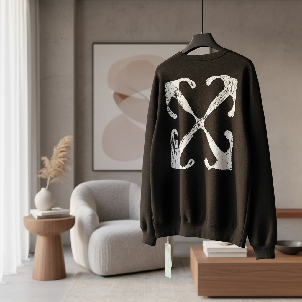 Off-White black crewneck sweatshirt made of premium soft breathable cotton, featuring iconic white graffiti-style X arrow design and transparent logo tag; unisex streetwear for daily casual style.