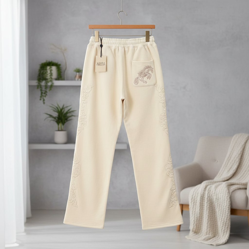 PantsDerschutze Beige Dragon Embroidered Knit Pants feature soft stretch fabric, 3D dragon embroidery on sides and back pocket, loose straight fit, breathable unisex design for casual streetwear style.