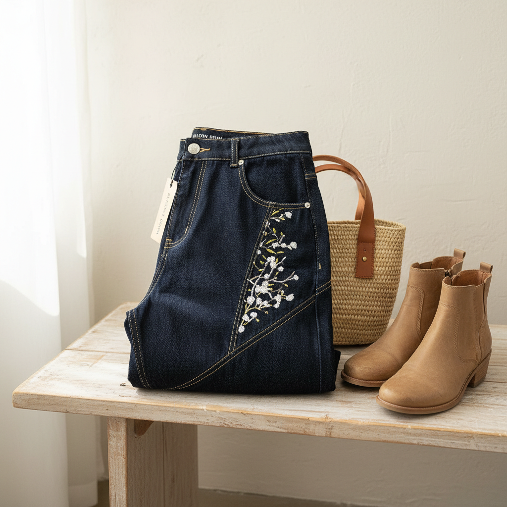 PantsDerschutze Deep Indigo Embroidered Jeans crafted from premium denim, featuring white floral embroidery and patchwork design. Loose straight fit for unisex casual style with vintage and modern charm.