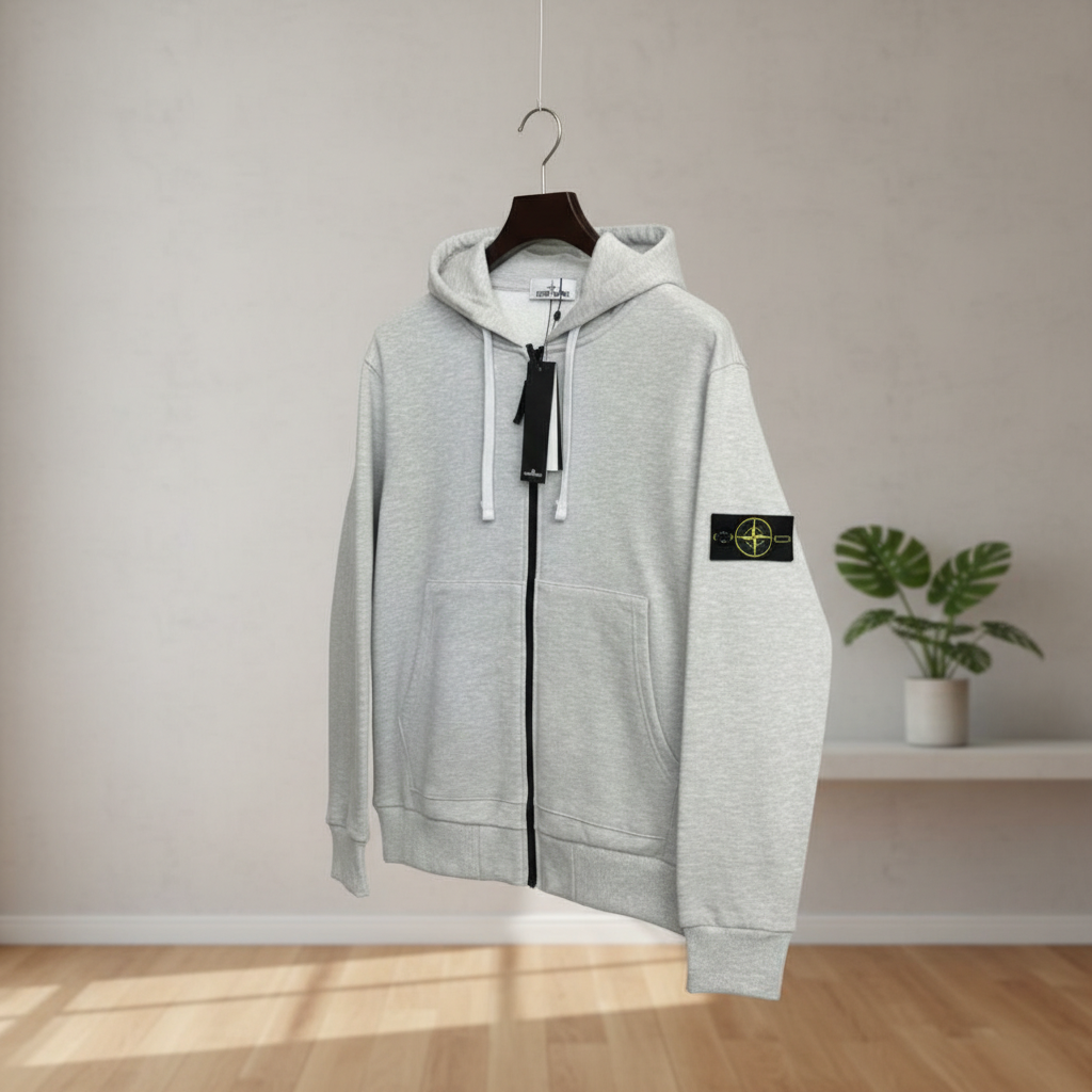 Stone Island Light Grey Full-Zip Hoodie crafted from soft breathable cotton blend, adjustable drawstring hood, iconic compass logo on sleeve, easy zip closure, unisex casual style.