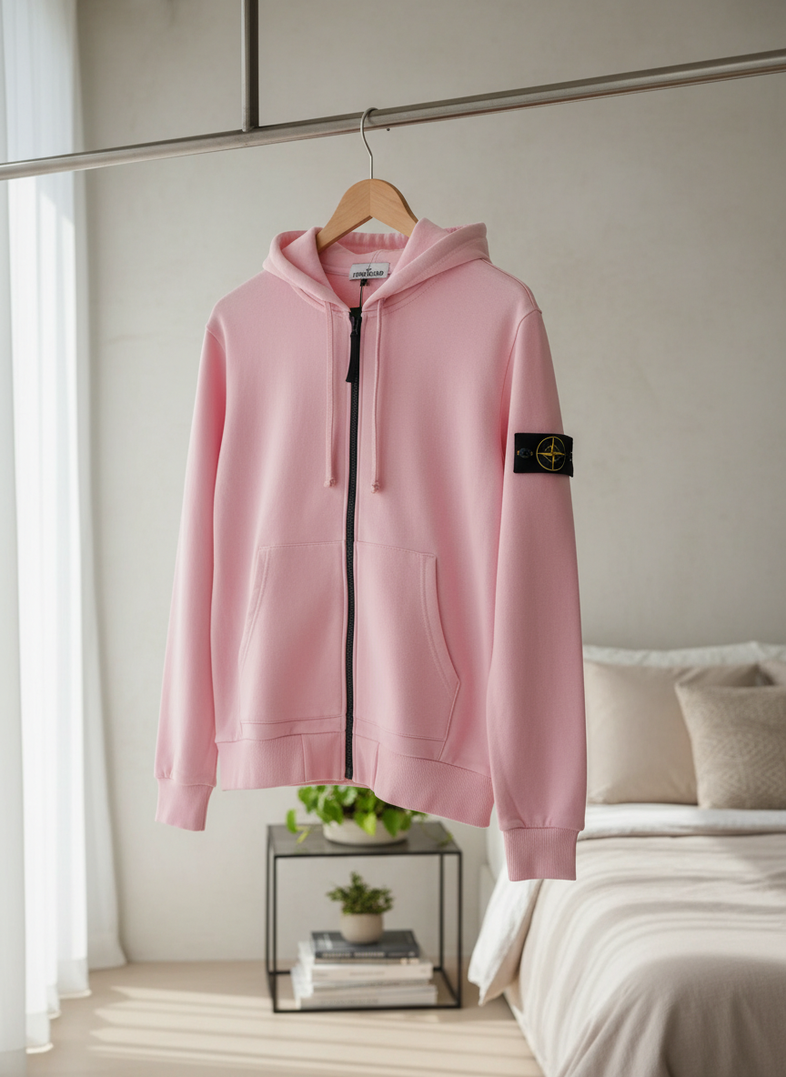 Stone Island Pink Zip-Up Hoodie crafted from soft breathable cotton, features adjustable drawstring hood, practical kangaroo pocket, iconic arm badge & compass tag, unisex streetwear style.