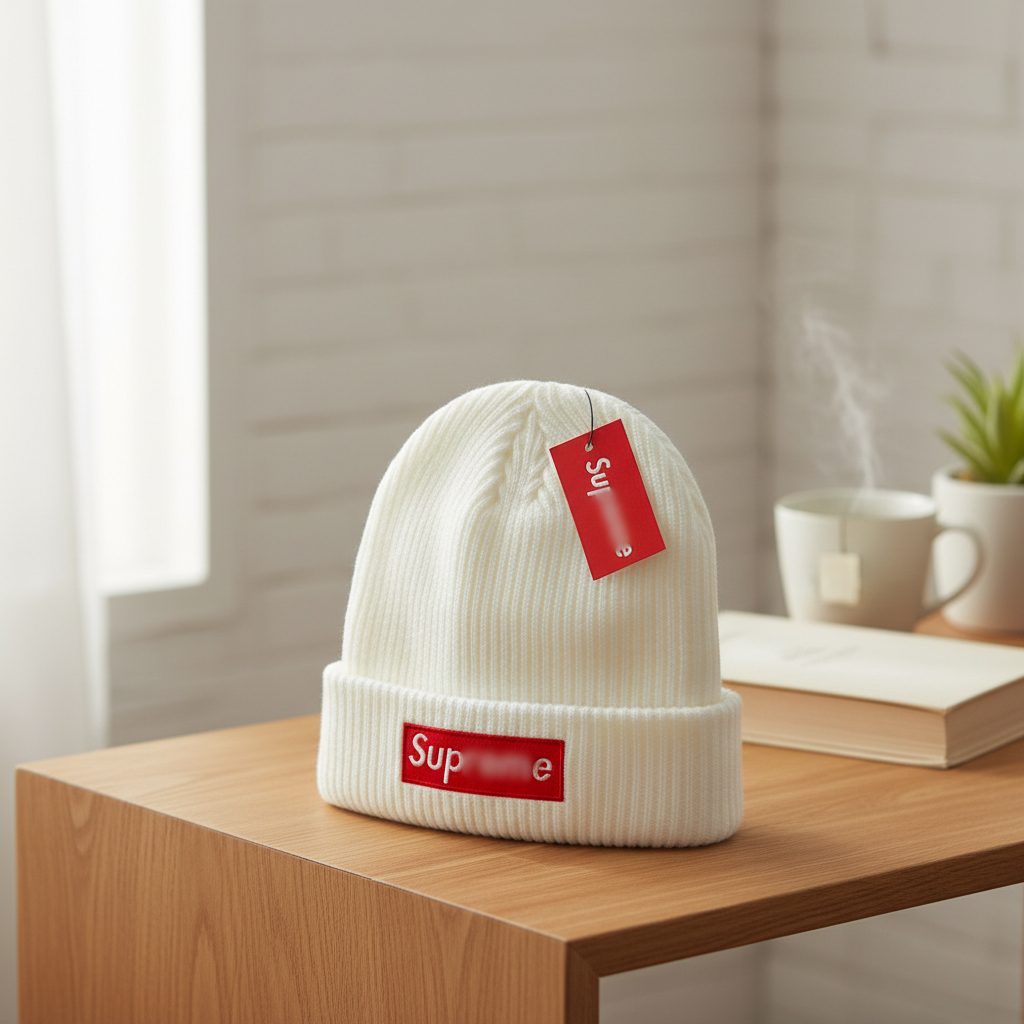 Supreme White Classic Knit Beanie, made of premium fabric for warmth and comfort, features ribbed texture, red logo patch, matching tag design, unisex streetwear style, stylish and practical.